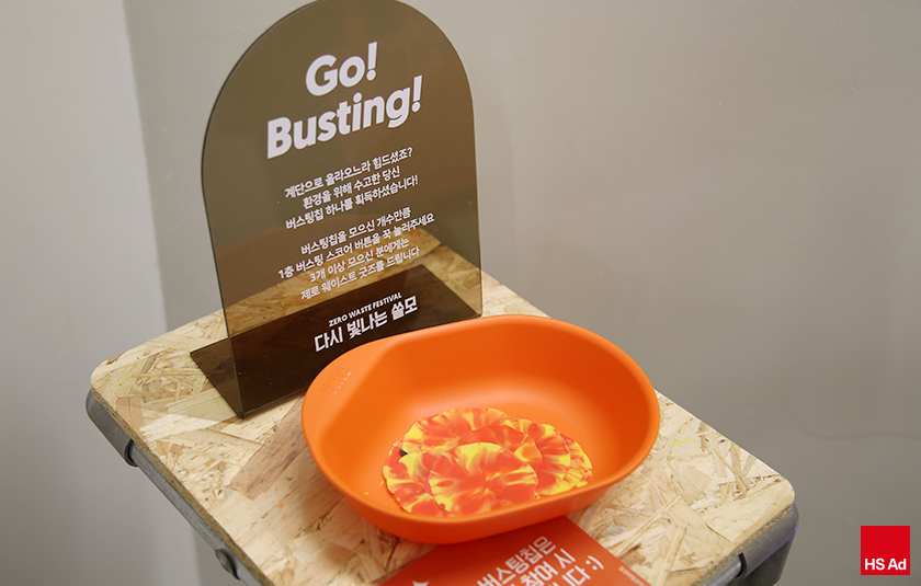 “조성된 공간 중 가장 작지만, 고객이 가장 제로웨이스트에 쉽게 참여할 수 있는 곳이 계단이라고 생각해요. 몇몇 활동은 카페에서 음료를 사거나 굿즈를 사는 등 직접 구매를 하는 과정에서 칩을 획득하게 되는데요. 계단은 엘리베이터를 포기하고 오르내리면 칩을 획득할 수 있는 가장 간단한 실천이에요. 쉽기에 공간이 가진 의미는 그 어떤 곳보다 큰 곳이기도 하고요. 실제로 고객분들의 참여율이 가장 높은 공간 역시 계단이랍니다.” (HS애드 BE솔루션 4팀 김혁 CM)
