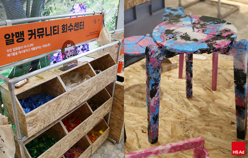 “알맹상점은 진정성 있는 콘텐츠를 가진 곳이라는 점이 무엇보다 좋았어요. 저희 Zero Waste Festival “다시 빛나는 쓸모”와 함께 한다면 좋은 시너지가 날 것임을 확신하여 협업하게 되었죠. 페트병을 분리수거해야 한다는 것은 모두가 알고 있지만, 병뚜껑은 따로 모아 색깔별로 구분해야 한다는 사실은 많은 분이 모르고 계세요. 공간 내 1층 알맹상점 옆에는 색별로 구분할 수 있는 회수센터가 있는데요. 실제로 많은 고객이 1차 방문 후 사용했던 병뚜껑을 모아 재방문하기도 한답니다.” (HS애드 BE솔루션 4팀 이유진 CM)