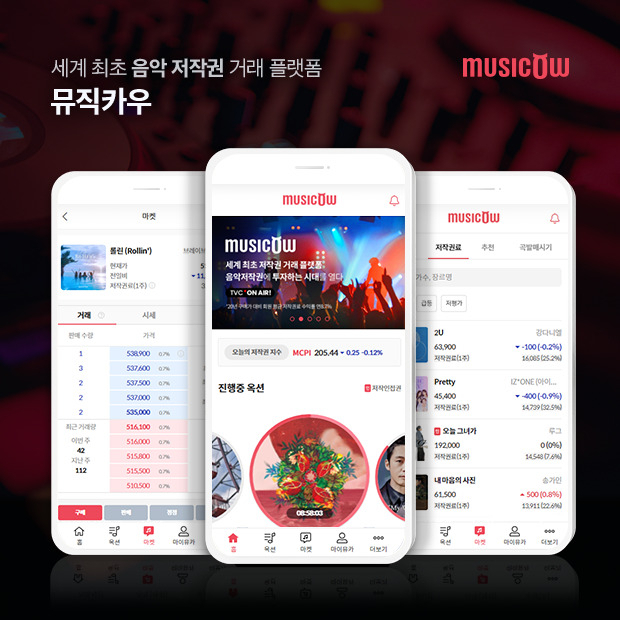 음악 저작권 공유 플랫폼으로는 뮤직카우가 있습니다. 뮤직카우의 이용자 수는 약 50만 명에 달하며 이 중 70%가 2030세대라고 하는데요. 뮤직카우는 매달 곡의 저작권 지분을 경매로 판매하면 이를 산 투자자들이 뮤직카우 플랫폼 내에서 지분을 주식처럼 거래하는 방식으로 진행되고 있습니다.