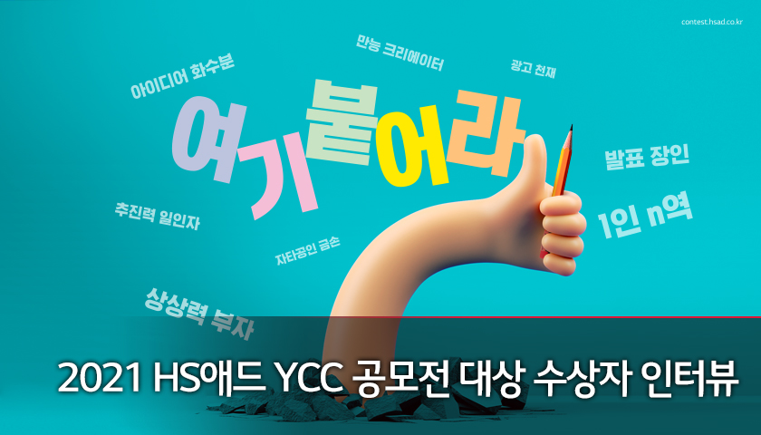모든 참가자들이 열정을 다해 선보인 작품으로 뜨겁게 진행된 2021 HS애드 YCC 광고 공모전! 내년에는 또 어떤 영크리에이터가 우리를 놀라게 할지 기대되는데요. 앞으로도 HS애드의 YCC가 예비 광고인들이 꿈을 펼칠 수 있는 무대가 될 수 있도록 계속해서 많은 관심 부탁드립니다!