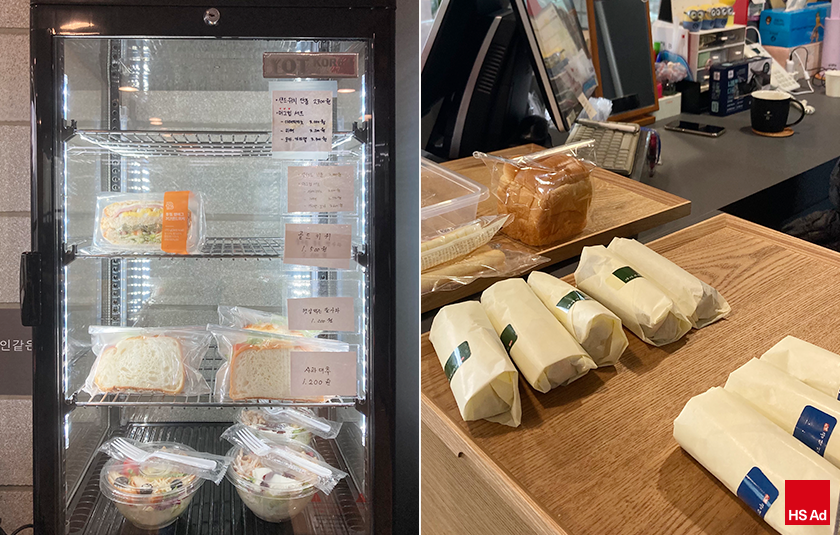 음료 외에도 빵, 견과류, 과자, 요거트, 바나나 등 여러 가지 음식도 함께 판매 중입니다. 정말 없을 것 없이 거의 다 구비되어 있고 1층이라 출근하는 길에 들를 수 있다는 점도 편리합니다.