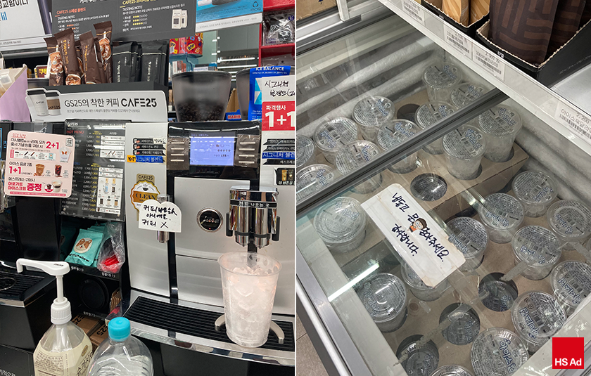 마지막으로 빌딩 내 지하 1층 GS25 편의점 커피를 소개합니다. 편의점 내에 있는 커피머신이다 보니 카페라고 하기에는 다소 부족할 수 있지만, 사내에 많은 임직원분들이 애용하는 카페 중 한 곳입니다. 간식과 커피를 같이 구매할 수 있고 지하 구내식당 옆에 있어 점심 식사 이후에 자연스럽게 커피를 사러 가곤 합니다.