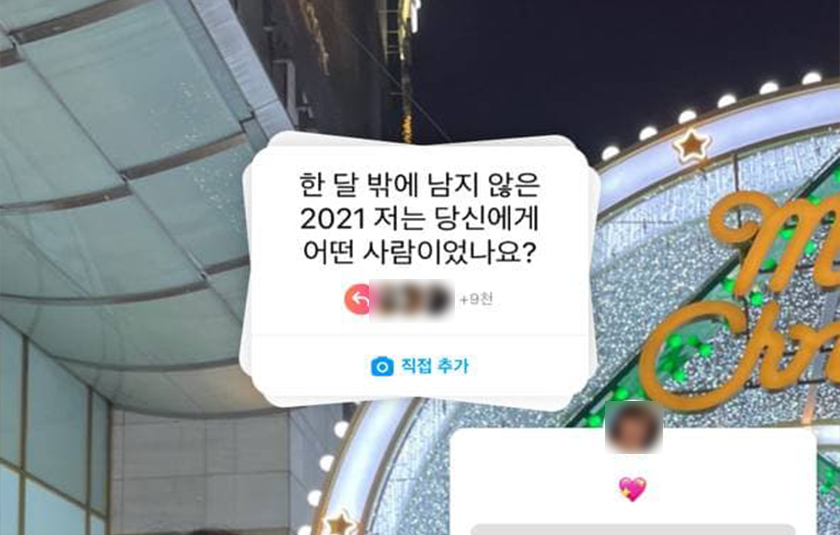 가장 최근에는 ‘한 달 남은 2021년, 저는 당신에게 어떤 사람이었나요?’라는 주제로 지인들의 답변을 받고 이를 통해 소통을 이어가며 하나의 콘텐츠를 만드는 모습을 보이고 있습니다. 간단한 방법으로 많은 사람들과 소통의 장을 이어갈 수 있다는 점, 참여를 이끌어낼 수 있다는 점에서 해당 기능은 개인뿐 아니라 기업 마케팅 수단으로 활용되기도 좋을 것으로 보입니다.