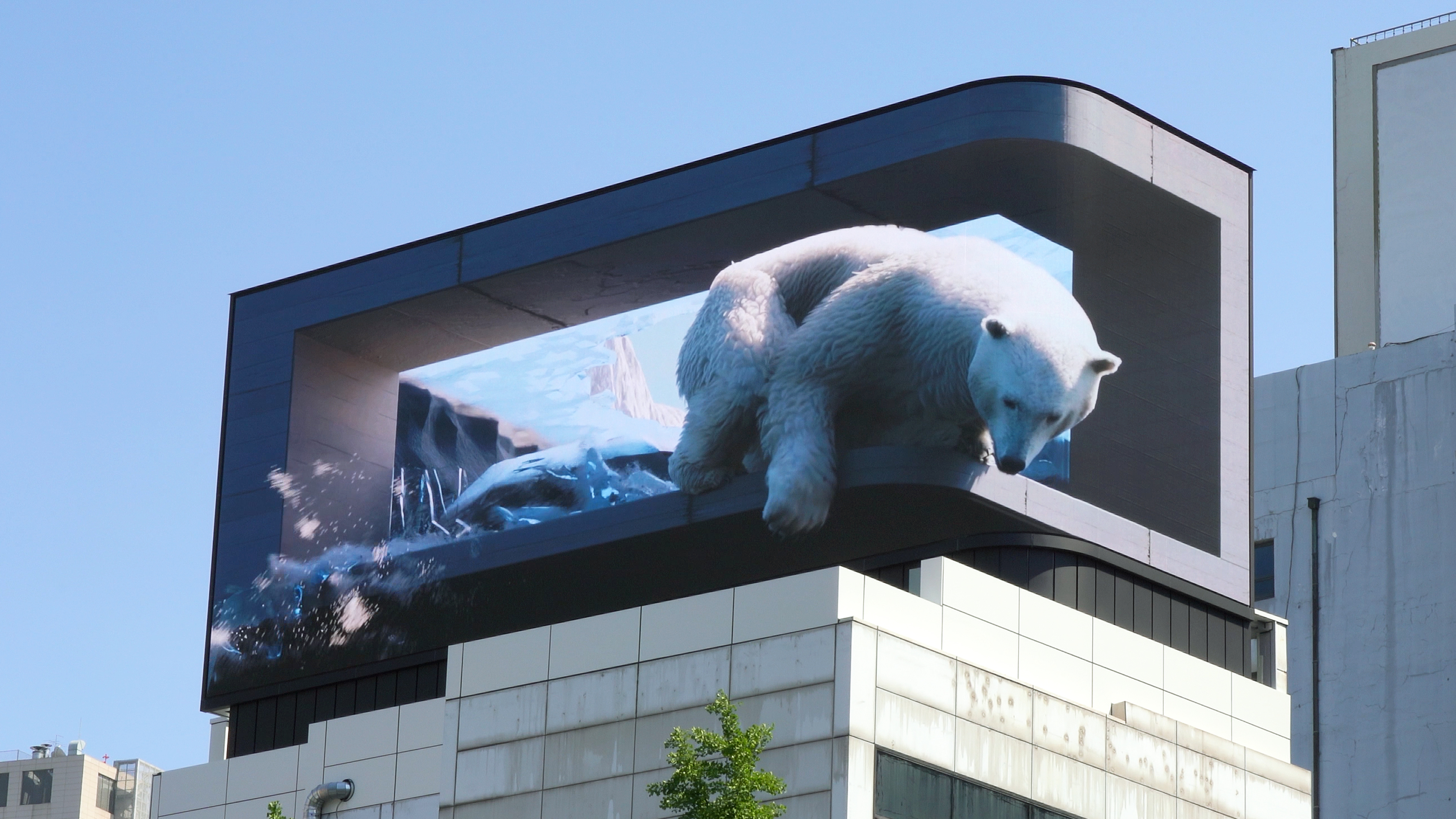 5일 서울 시청역 인근 건물 옥상 전광판에 물에 빠진 대형 북극곰이 마치 눈 앞에서 허우적대다 포효하며 다시 물위로 올라가는 듯한 영상이 등장했습니다. 이 영상은 착시 효과로 시민들의 눈길을 끌었습니다.