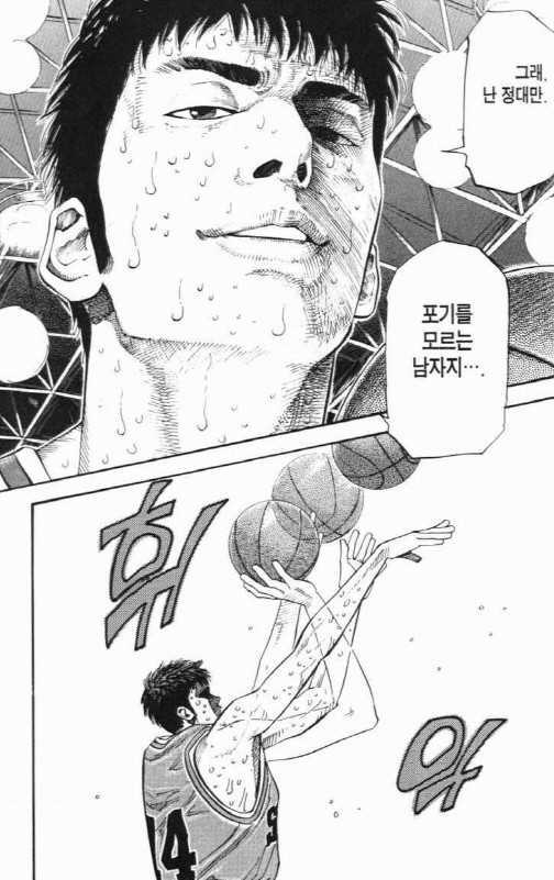 🔥불.꽃.남.자.정.대.만🔥을 잇는 그의 명언 '포기를 모르는 남자'. 체력적으로 열세하지만 모든 경기에 진심을 다하고, 체력 고갈을 이겨내는 정신력과 3점 슛의 실력을 보여주는 정대만과 잘 어울리는 대사예요.