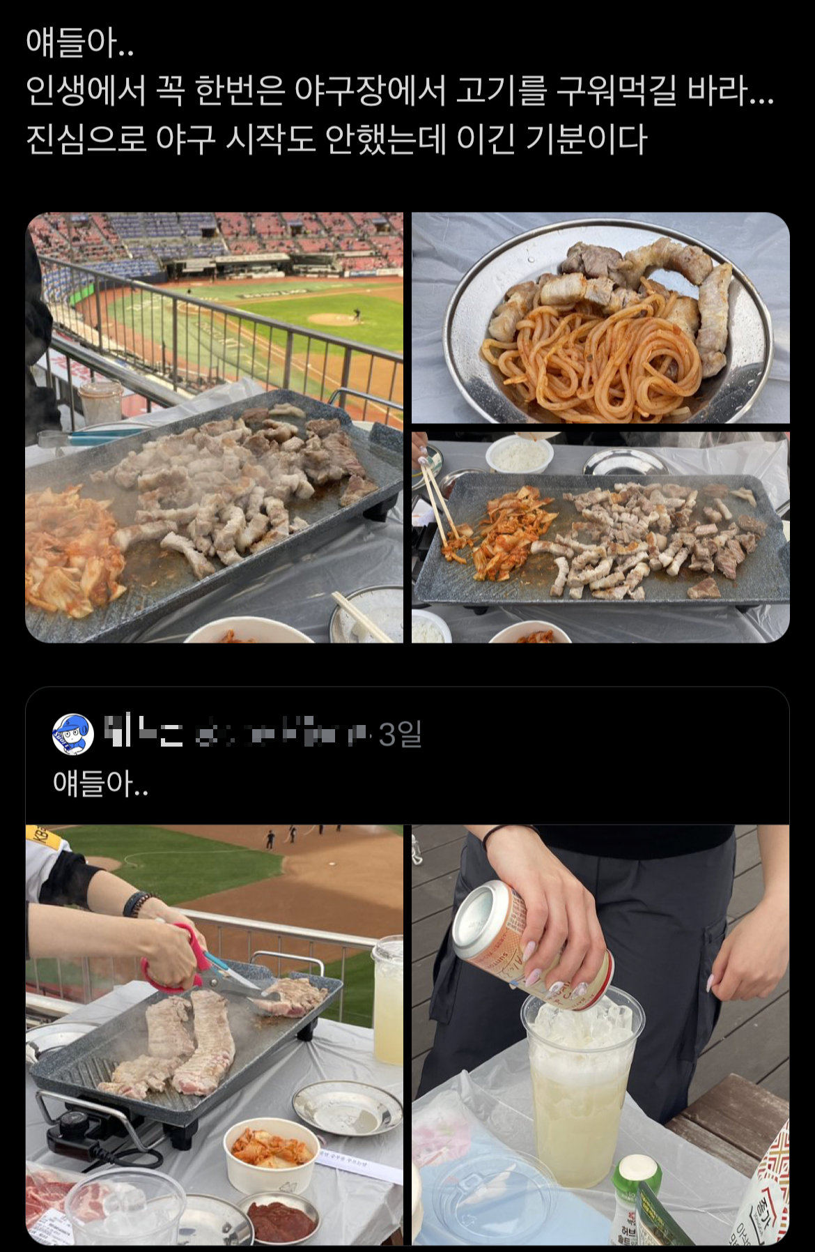 자신이 야구 경기를 보며 먹은 음식을 올리기도 하고, 야푸를 추천하거나 추천 받는 사람도 많아지고 있어요. 또한, 야구장에는 고기를 구워먹을 수 있는 고기 굽는 좌석 일명 '고굽좌'가 있다는 사실!