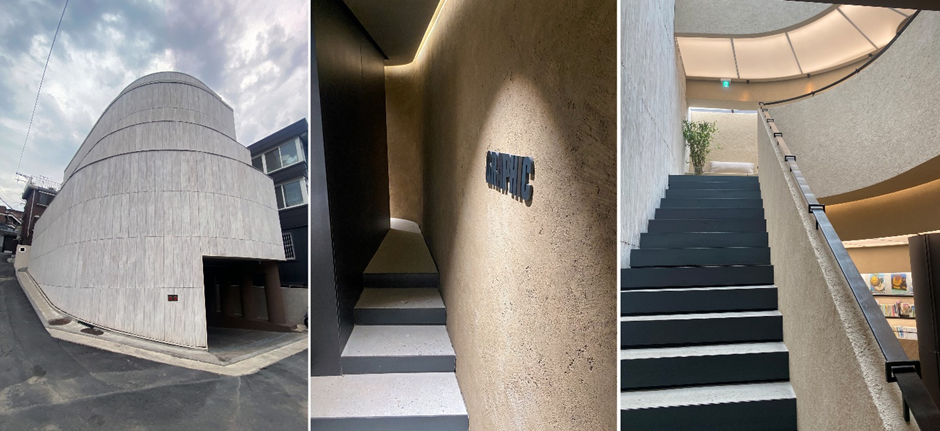 조용한 주택가 골목 안쪽에 위치한 그래픽은 마치 두꺼운 책의 단면과 같은 외관부터 궁금증을 불러일으킵니다. 딱히 간판도 없어 긴가민가하면서 건물 옆쪽 철문을 밀고 들어가면 비밀스러운 공간으로 들어가는 듯한 조용한 복도를 만나게 되는데요. 이곳에서 방문객들은 카운터에 비치된 QR코드를 스캔하면 만화로 표현된 이용 안내를 확인할 수 있습니다.