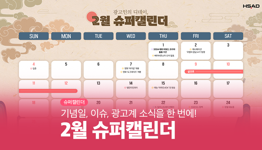 | [HS슈퍼캘린더] 광고인이라면 알아두어야 할 03월의 디데이🌱 (1) | 2024.02.06 |
