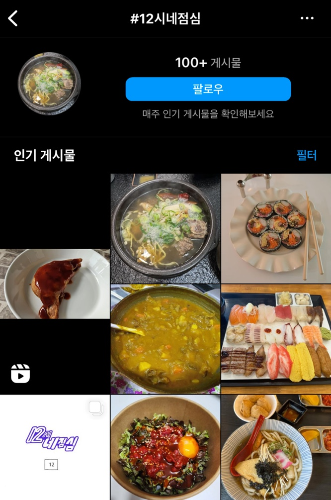 이러한 12시네 점심을 보던 한 구독자가 '12시네 점심 해시태그를 붙여 점심을 공유하자'는 내용의 댓글을 달며 인스타그램을 통해 12시네 점심 챌린지(?)가 진행되고 있어요.