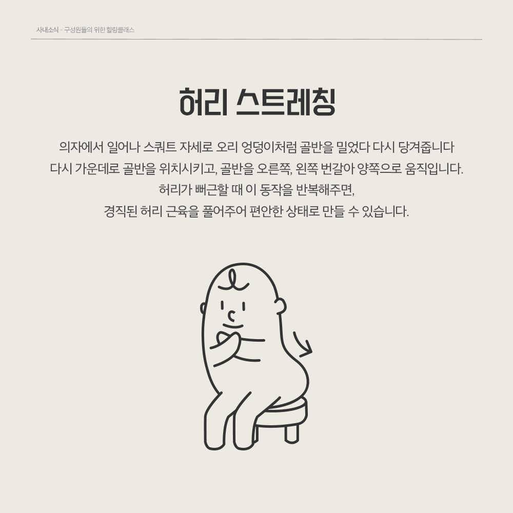 허리 스트레칭부터, 목, 등 그리고 척추 스트레칭까지 알차게 배워보았는데요! 지금 이 글을 보고 계시는 여러분도 손 머리 위로 좌우로 흔들흔들~ 골반도 들고 좌우로 흔들흔들~
