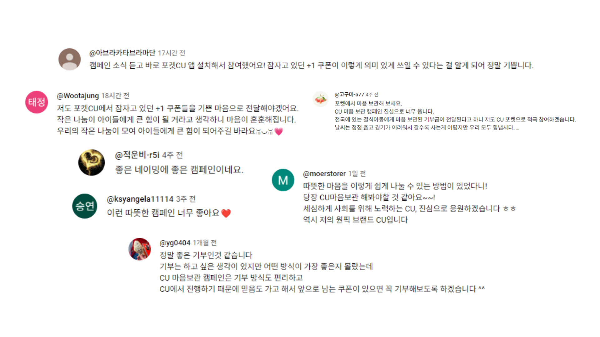 CU Youtube에 캠페인 영상이 올라 온지 불과 15일 만에 달린 약 1,000건의 따뜻한 마음들