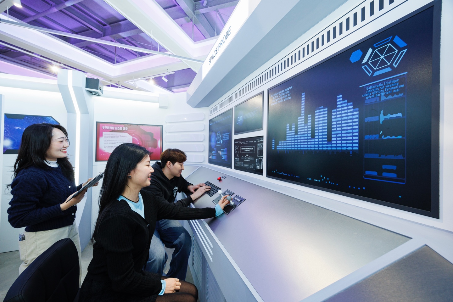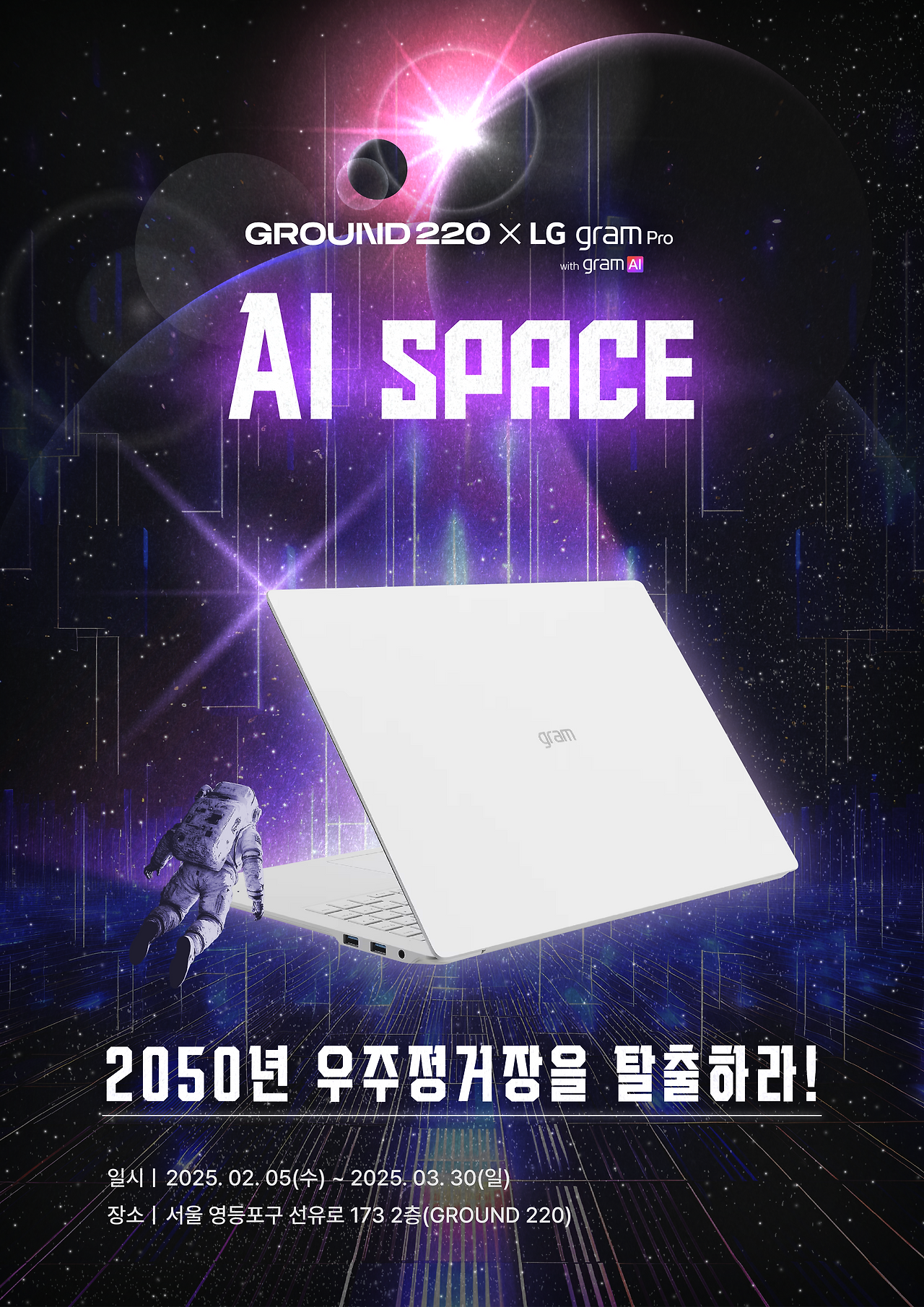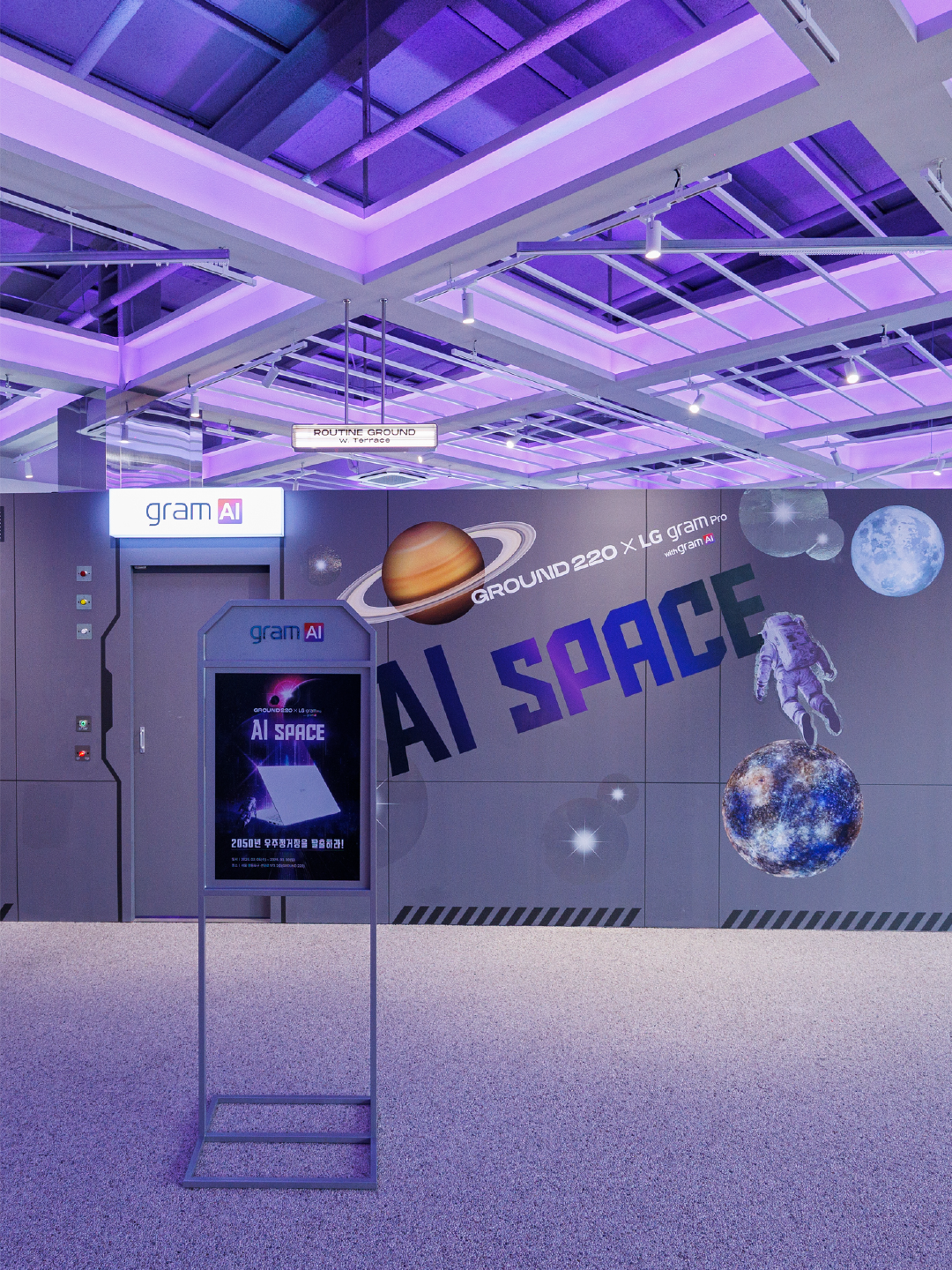 ‘25년형 그램 Pro의 대표 USP인 ‘타임트래블’ 기능에서 착안하여, 과거와 미래가 공존하는 공간인 ‘우주’를 배경으로 ‘AI SPACE’라는 콘셉트를 개발했습니다. 콘셉트에 맞게, 그리고 제품의 혁신적인 이미지를 강조하기 위해 퓨쳐리스틱 한 느낌으로 공간을 구성하였습니다.