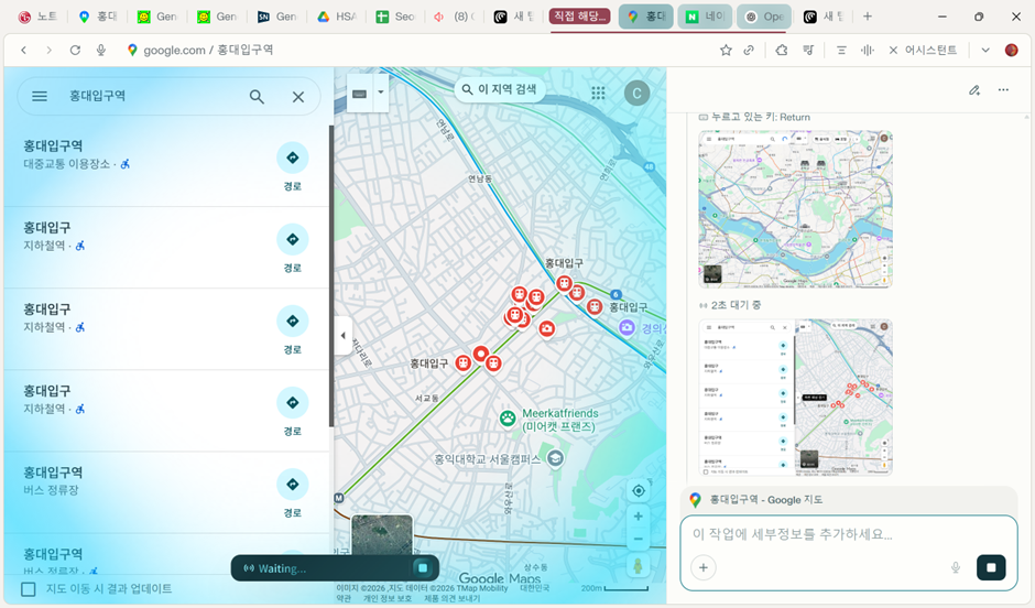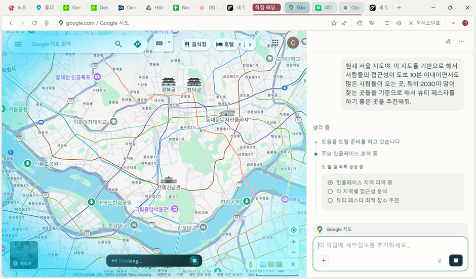 이 기능도 정말 쇼킹합니다. 저는 사실 주로 맛집을 찾을 때, 여행을 갈 때 많이 활용하곤 하는데, 마케팅 관점에서는 어디에서 전시회나 매장을 열지 등을 결정할 때 도움이 될 수 있습니다. 네이버 지도는 API가 막힌 듯해서 구글 지도를 활용하면 더 원하는 정보를 많이 얻을 수 있습니다. 지도를 AI가 스스로 검색하고 다니고, 기존 SNS나 뉴스, 블로그 등의 정보를 전부 조합해서 알려주기 때문에 시간을 대폭 단축할 수 있습니다.