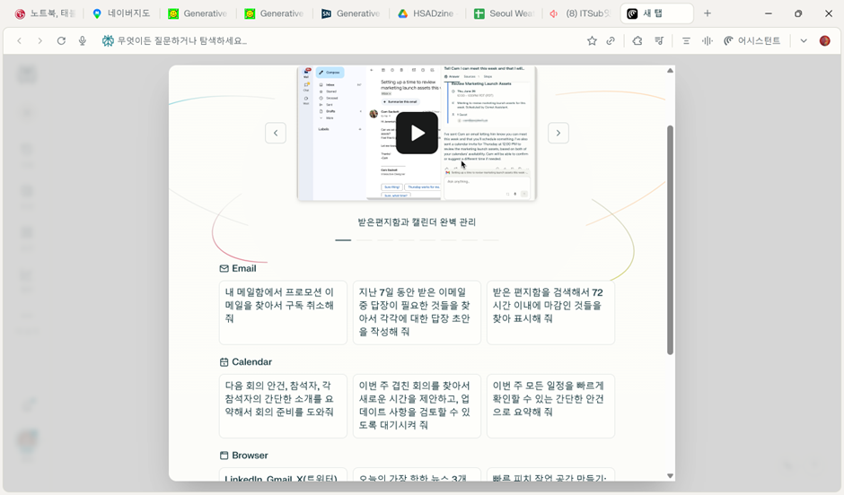 먼저 기본적인 사용 방법을 말씀드리겠습니다. 채팅 자체는 ChatGPT와 사용하는 방법은 거의 같습니다. 크롬이나 엣지와 같은 브라우저에 ChatGPT 같은 서비스가 얹어졌다고 보시면 되겠습니다. 하지만 특정 페이지에 들어가서 오른쪽 위의 어시스턴트 버튼을 누르면 완전 새로운 AI Agent 세상이 펼쳐집니다! 그럼 브라우저에서 사용하는 지메일, 캘린더를 포함해 모든 것이 일일이 스크린샷 찍어서 물어볼 필요 없이 즉시 AI와 대화를 통해서 클릭도 하지 않고 브라우저를 조종할 수 있습니다.