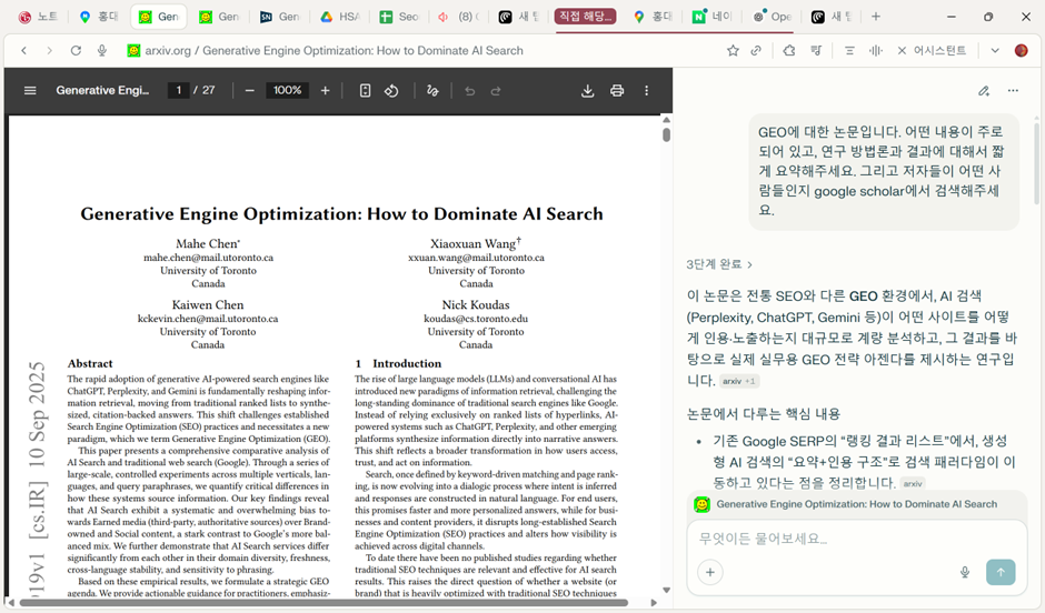 GEO에 대한 논문입니다. 원래는 분석하기 정말 어려운 게 맞는데… 게다가 저자들이 어떤 사람들인지 Google Scholar에서 찾아서 알려주기까지 합니다. 이런 작업 하나 하려면 박사급이어도 족히 3시간은 걸리는데 3초 만에 할 수 있게 되었습니다. 출처까지 달아주니 신뢰도도 굉장히 높습니다. 같은 원리로 PDF 형태로 되어 있다면, 즉 브라우저에서 열리기만 한다면 어떤 자료든 모두 분석할 수 있습니다.