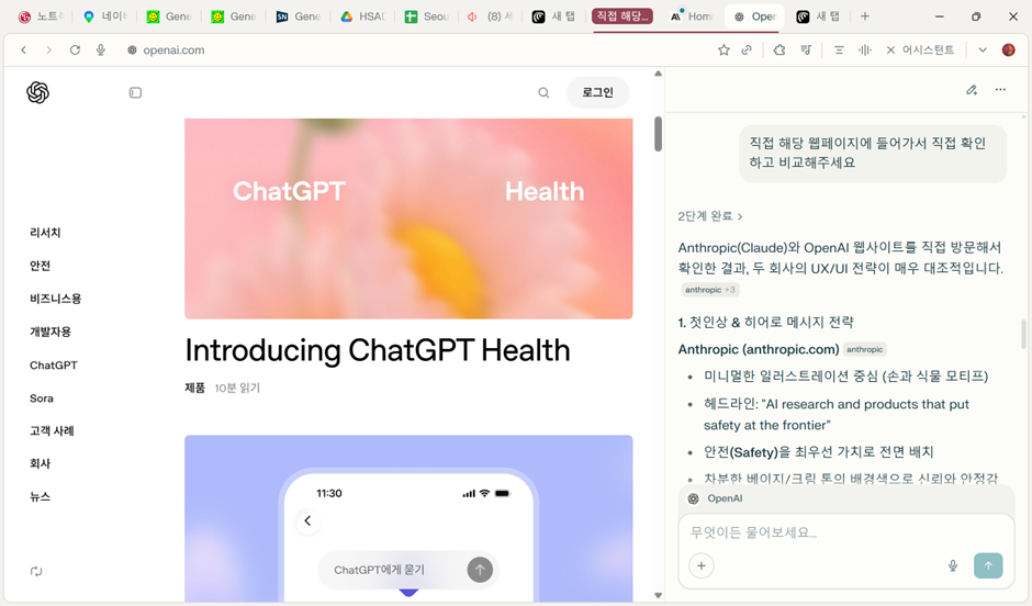 글로벌 AI 서비스인 Claude와 OpenAI의 웹사이트의 UX/UI를 분석해 달라고 했습니다. 경쟁사 비교는 언제나 기본이죠! 근데 간혹 그냥 Wikipedia 내용이나 웹 검색으로 그냥 정보를 확인해서 말해주는 경우도 있습니다. 웹페이지에 직접 들어가서 해보기를 원하신다면 저처럼 직접 웹페이지에 들어가라고 하거나, 웹사이트 링크를 주면 됩니다!