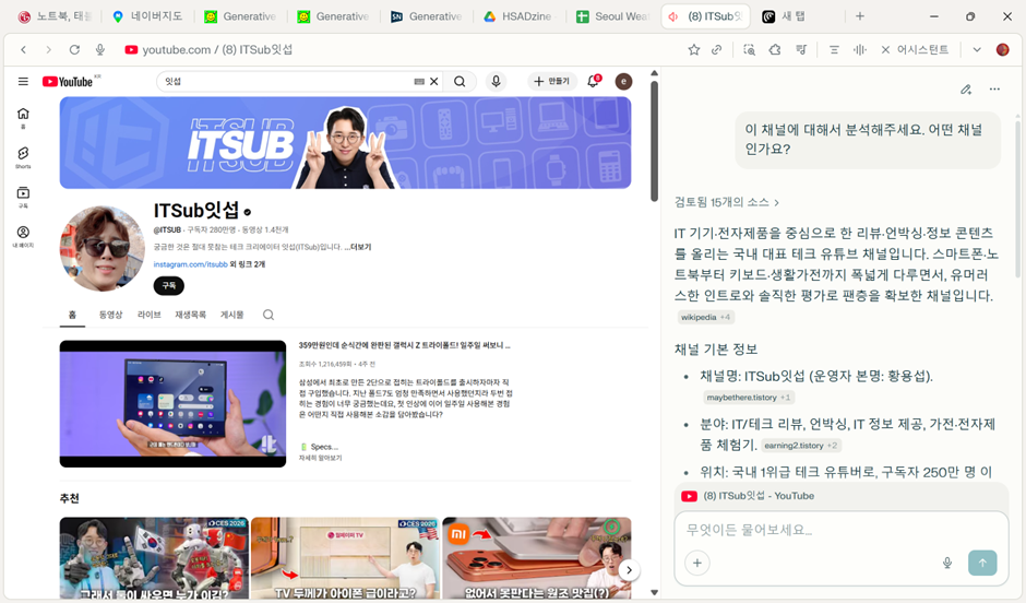 먼저 유튜브 콘텐츠 분석입니다. 이런 식으로 유튜브 채널에 대한 질문을 할 수 있습니다. 만일 특정 크리에이터에게 마케팅 협업 요청을 하고 싶을 때에는 기존 영상들에서 우호적이었는지, 어떤 점들을 주로 언급했는지 등을 채팅 한 번으로 확인할 수 있게 됩니다.